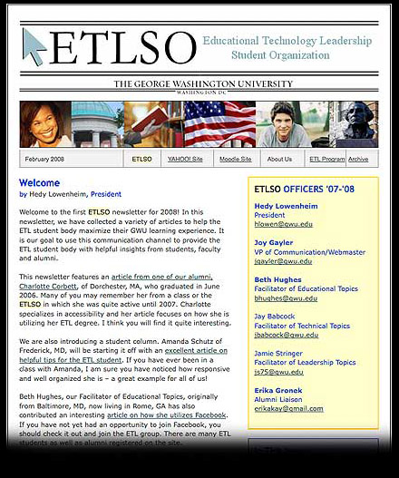 Was the founder and president of ETLSO: The Educational Technology Leadership Student Organization (ETLSO) that connects students of the GWU ETL program with each other and the GWU campus. Most ETL students study from a distance. They are located throughout the United States and other parts of the world. They are separated by geography but joined by technology. This organization is a forum for social and educational events. It is a place to network, demonstrate leadership, practice technology skills, and prepare for the work place. After graduating and passing the project on to successors, ETLSO has lasted for another 10 years and is still going.